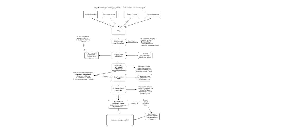 Компания «Осирис» — производитель элитных аксессуаров (портмоне, кошельки и т.д.) обратилась в нашу компанию за помощью в настройке CRM-системы для настройки работы отдела продаж. Так как компания была создана совсем недавно, то процесс продаж еще не был до конца отработан. Перед нами встала задача вместе с руководителем компании стандартизировать процесс продаж и согласно полученным данным настроить CRM-систему.