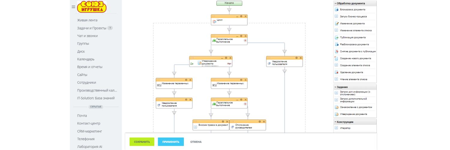 Было настроено 2 типа бизнес-процесса: простой (прямая служебная записка) и сложный (служебка с согласованием).