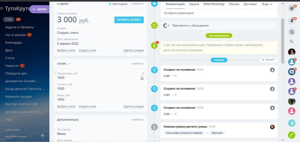 В первую очередь мы упростили жизнь отделу продаж. Каким образом? Сначала добавили в карточку сделки три дополнительных поля: Предоплата, Остаток и Меню. Когда менеджеры их заполняли - менялась итоговая сумма Сделки. Для следующей стадии “Создание Счетов” мы настроили бизнес-процесс. Он завязан на соответствии сумм из дополнительных полей - по каждому полю автоматически создавался отдельный счет. Менеджерам оставалось только проставить дату и статус оплаты - а это не занимает много времени. Научили сотрудников, как пользоваться таким функционалом, показали, как это просто и удобно.
